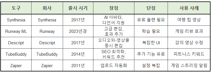 | Runway ML | Runway | 2023년경 | 고급 편집, 효과 추가 | 학습 필요 | 게임 리뷰 효과 |