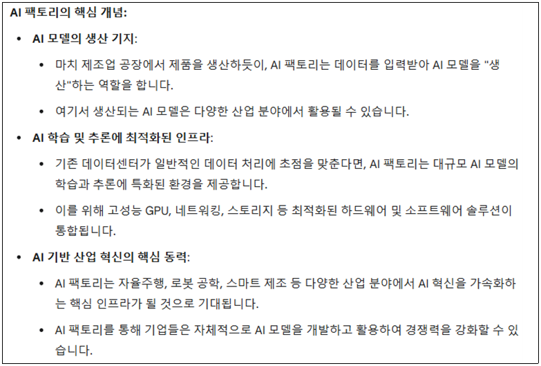 이를 상징적으로 설명하는 개념이 바로 ‘AI 팩토리(AI Factory)’입니다. 단순 자동화 공장을 넘어, AI는 정보를 스스로 판단하고 실행하는 ‘자율 시스템’으로 기능하며, 기업 운영을 근본적으로 혁신할 기반이 된다는 것입니다.